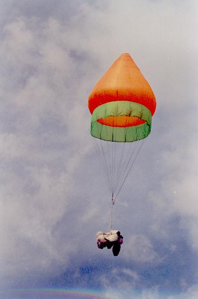 A few years ago when scheduled to drop bears at Hengistbury we were inundated instead by a plethora of soft cuddly rabbits. So much so that I decided they should have their own speciality, hence the carrot parachute soon to become abbreviated to the carochute.Unfortunately they do not retard downward progress if made the natural way up hence the inversion. The first attempt was a rather weedy affair suitable only for the under nourished so a second was developed and it is that one which is detailed here. The dimensions given are for 1/2 gore with no allowance for seams or hems(add 5mm each side) on a 16 gore version of about 1000mm diameter. Seen here in full flight with a 1kg. rabbit bellow. Back packs have to be you own design for the particular bunny. Mine's harness had to be divided to allow access for the tail.