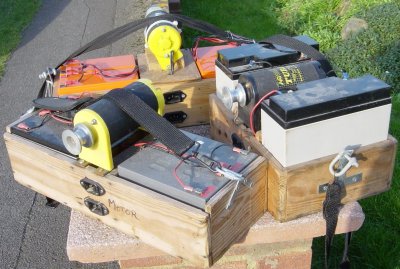 The next consideration is the battery(s). A lot of care must be given to this as any containing liquids can be very dangerous to transport and should be avoided. I prefer the sealed lead acid type as these do not have any chance of spilling hazardous chemicals and have very good capacity. The motor dictates the voltage so I use 12 volts. For a well attended 2 day event I find that I require a capacity of more than 20Ahr. The batteries are also used in my system to ballast the motor mounting and stop it kicking sideways under high torque. So that they can be distributed either side of the motor I find the most convenient to be 4 x 12V7Ahr or 2 x 12V15Ahr. These should all be wired in parallel and taken to the motor via a reversing switch. There are several ways of doing this as shown in circuit diagrams. or in Autocad.