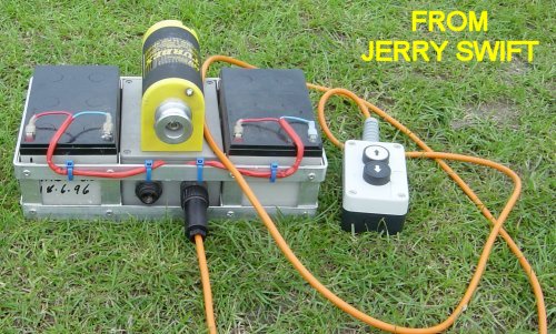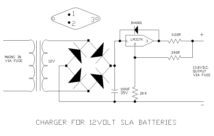 If you are using SLA batteries you must note that these require the correct type of charge. A car battery charger will not do and will damage the batteries immediately. A constant voltage charger set to 13.8V must be used. They can be purchased at a reasonable price from Maplins or if you are into building electronics a simple circuit is shown here. Note If this type of battery drops below 10V they will not recharge to a state where they have any capacity and they are also very susceptible to low temperatures. (ie. don't keep them in a shed where they are likely to freeze during the winter)